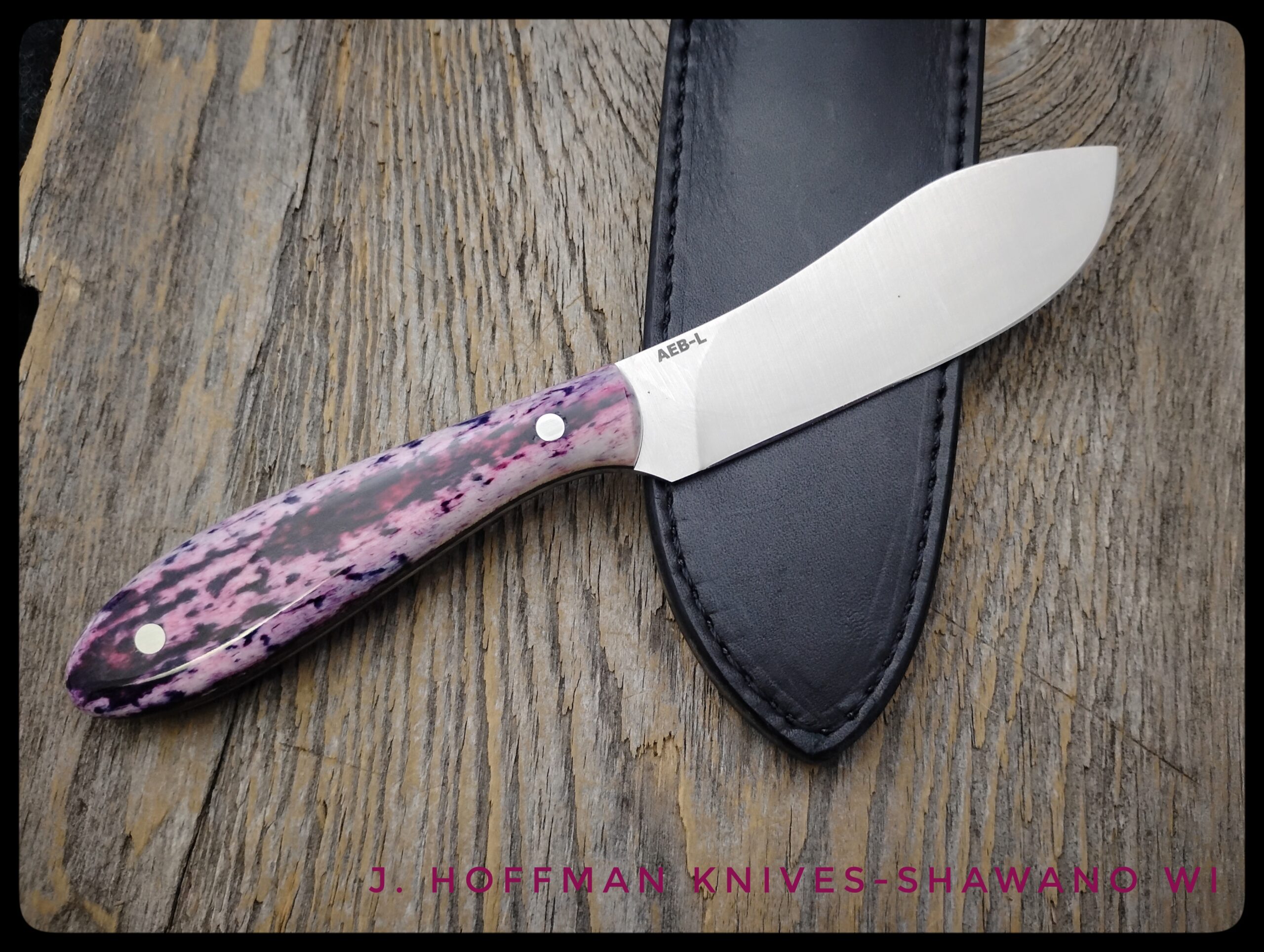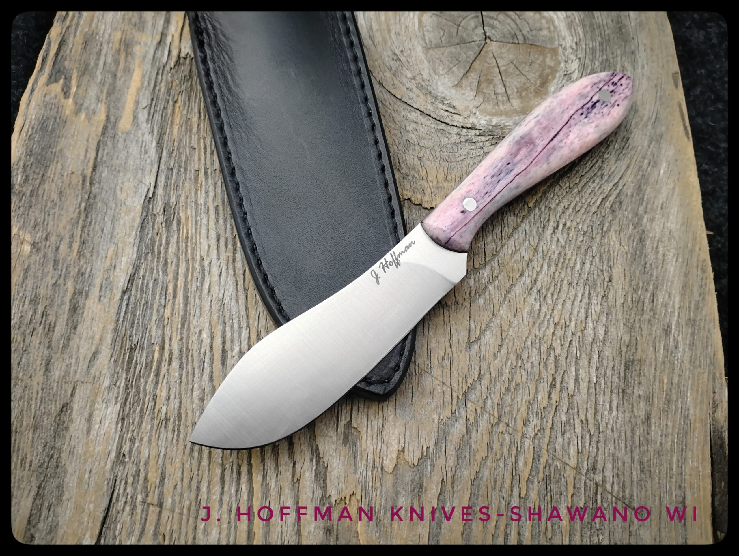 The Donegal is a cross between a Nessmuk and the Canadian Belt Knife. It’s a great hunting and skinning blade. The fuchsia color of this giraffe bone is gorgeous and unique.